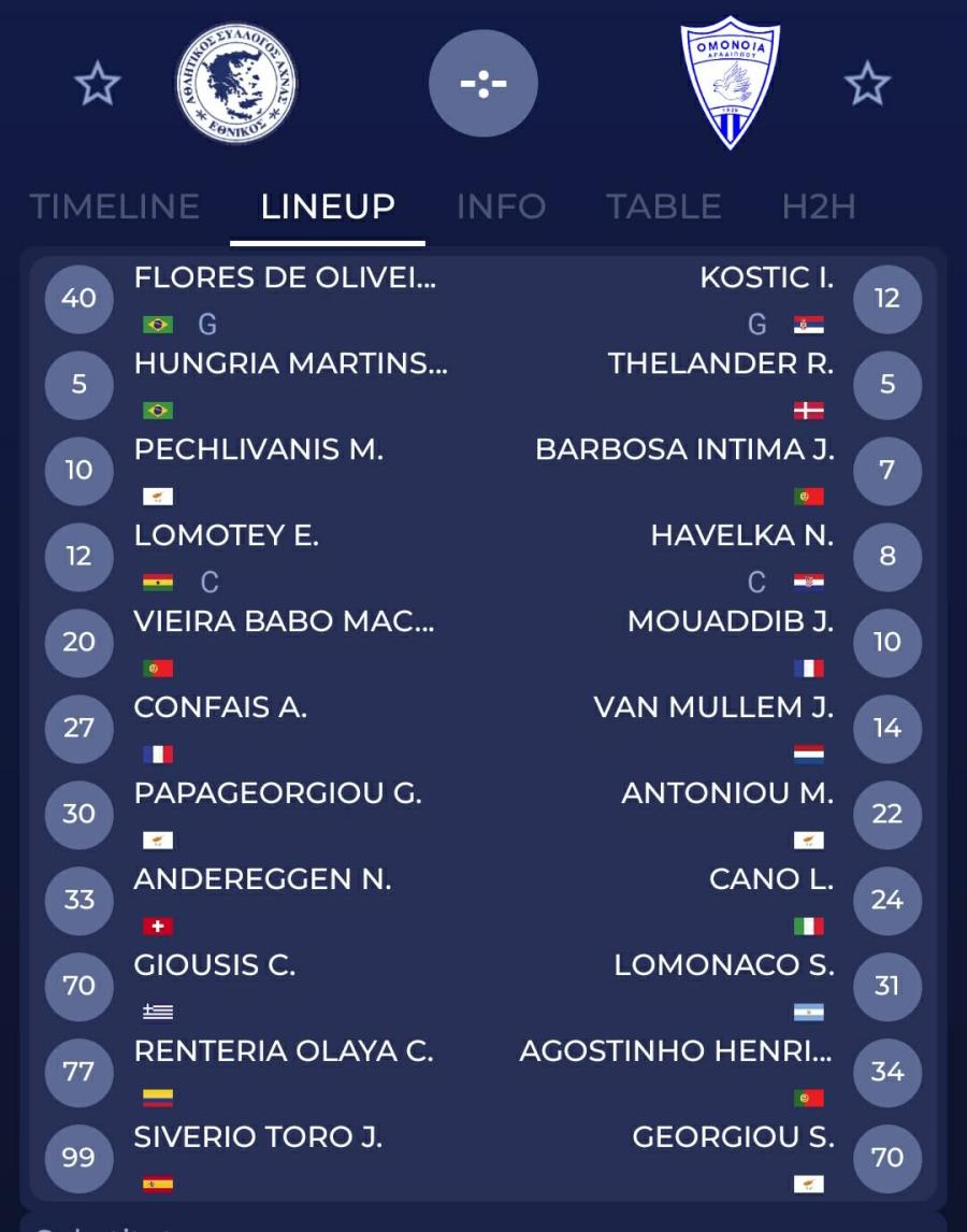 Κόστιτς, Μηνάς, Τελάντερ, Ενρίκε, Κάνο, Βαν Μιούλεμ, Χαβέλκα, Ζορζίνιο, Μουαντίπ, Γεωργίου, Λομόνακο.