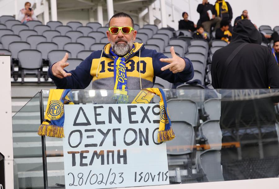 Ένας οπαδός της ΑΕΛ ανέβασε στην εξέδρα του σταδίου «Αλφαμέγα» ένα πλακάτ με το μήνυμα «Δεν έχω οξυγόνο - Τέμπη», για να τιμήσει τη μνήμη των 57 θυμάτων της πολύνεκρης τραγωδίας.