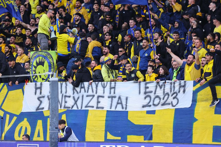 Λίγο αργότερα, ανέβηκε πανό και από τους οργανωμένους οπαδούς της ΑΕΛ για την τραγωδία των Τεμπων: