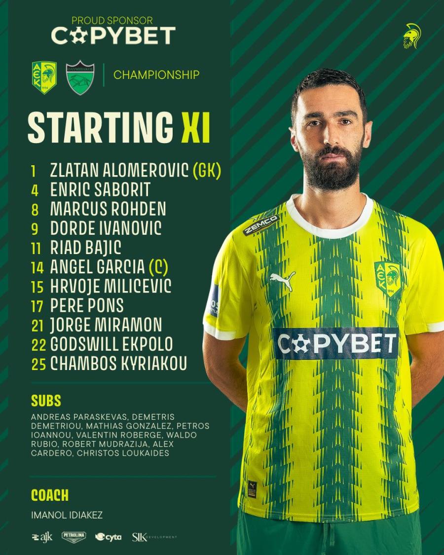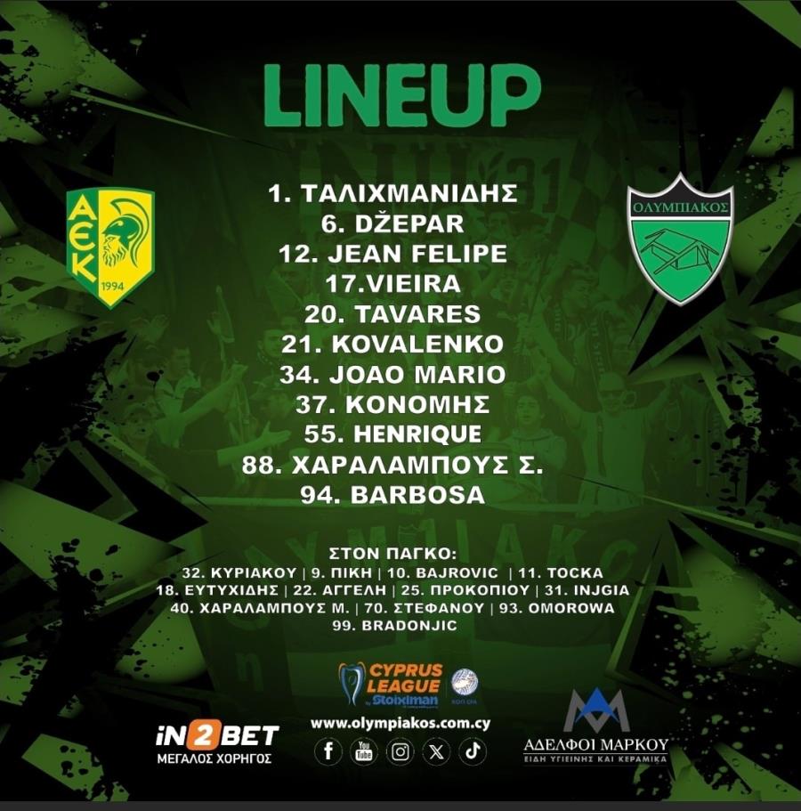 Στον πάγκο: Παρασκευά, Δημητρίου, Ιωάννου, Ρούμπιο, Ρομπέρζ, Μουντραζίγια, Λουκαίδης, Γκονζάλες, Καρδέρο.