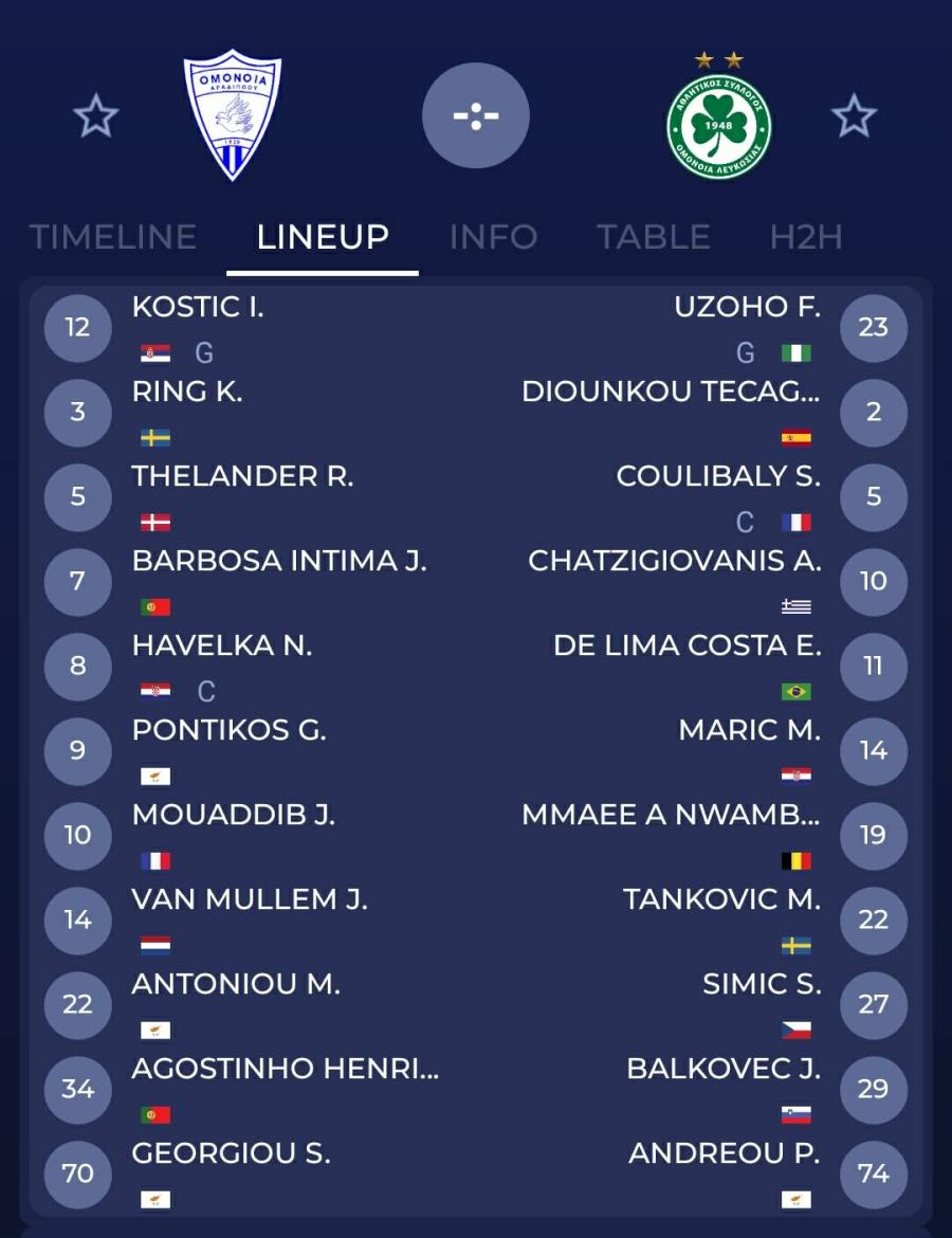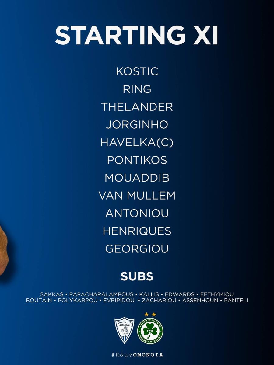 Ομόνοια Αρ.: Κόστιτς, Ρινκ, Τελάντερ, Ζορζίνιο, Χαβέλκα, Ποντικός, Μουαντίπ, Βαν Μιούλεμ, Αντωνίου, Γεωργίου, Ενρίκες.