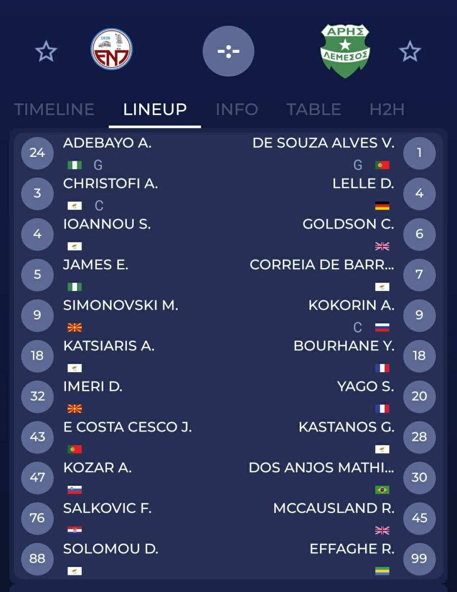 Δείτε την αρχική ενδεκάδα που επέλεξε ο προπονητής της ΕΝΠ, Μπόγιαν Μαρκόσκι, για το σημερινό (16:00) ματς στο «Τάσος Μάρκου» με αντίπαλο τον Άρη, για την 25η αγωνιστική της Cyprus League by Stoiximan: