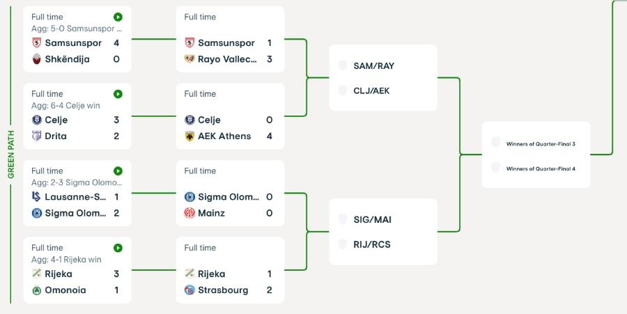 Στο μονοπάτι προς τον τελικό, στα ημιτελικά η ΑΕΚ θα διασταυρωθεί με τον νικητή ενός εκ των ζευγαριών Ριέκα- Στρασβούργο (1-2 πρώτο ματς) ή Σίγμα Όλομουτς-Μάιντζ (0-0). Το πρώτο παιχνίδι των ημιτελικών θα γίνει στην Allwyn Arena στις 30 Απριλίου, ενώ η ρεβάνς θα διεξαχθεί στις 7 Μαΐου.