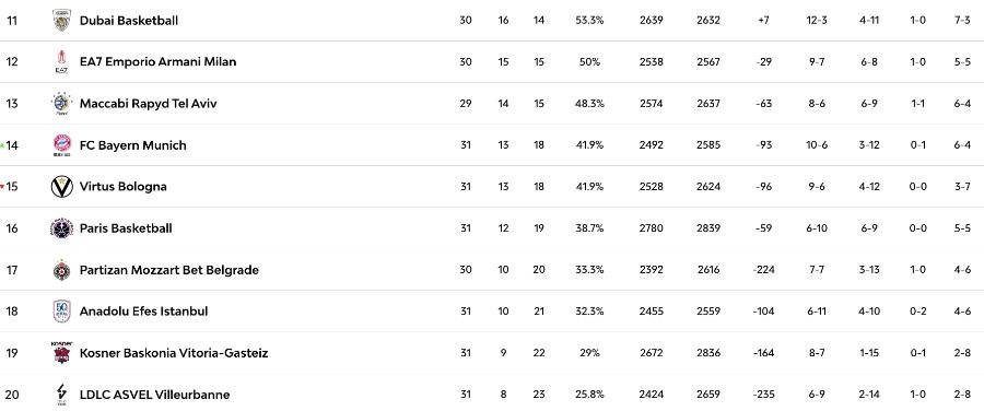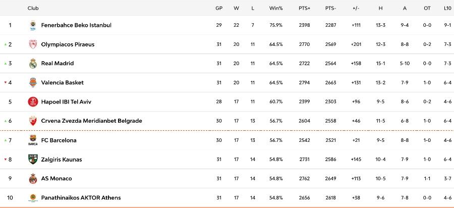 Στην κορυφή της βαθμολογίας παραμένουν οι Βαλένθια, Ολυμπιακός και Ρεάλ Μαδρίτης με 20-11, τρεις ομάδες που παλεύουν για την τετράδα, ενώ η Χάποελ -με τρία παιχνίδια λιγότερα- παραμένει απειλή για όλους, καθώς μπορεί να μπει δυναμικά στη διεκδίκηση του πλεονεκτήματος έδρας.