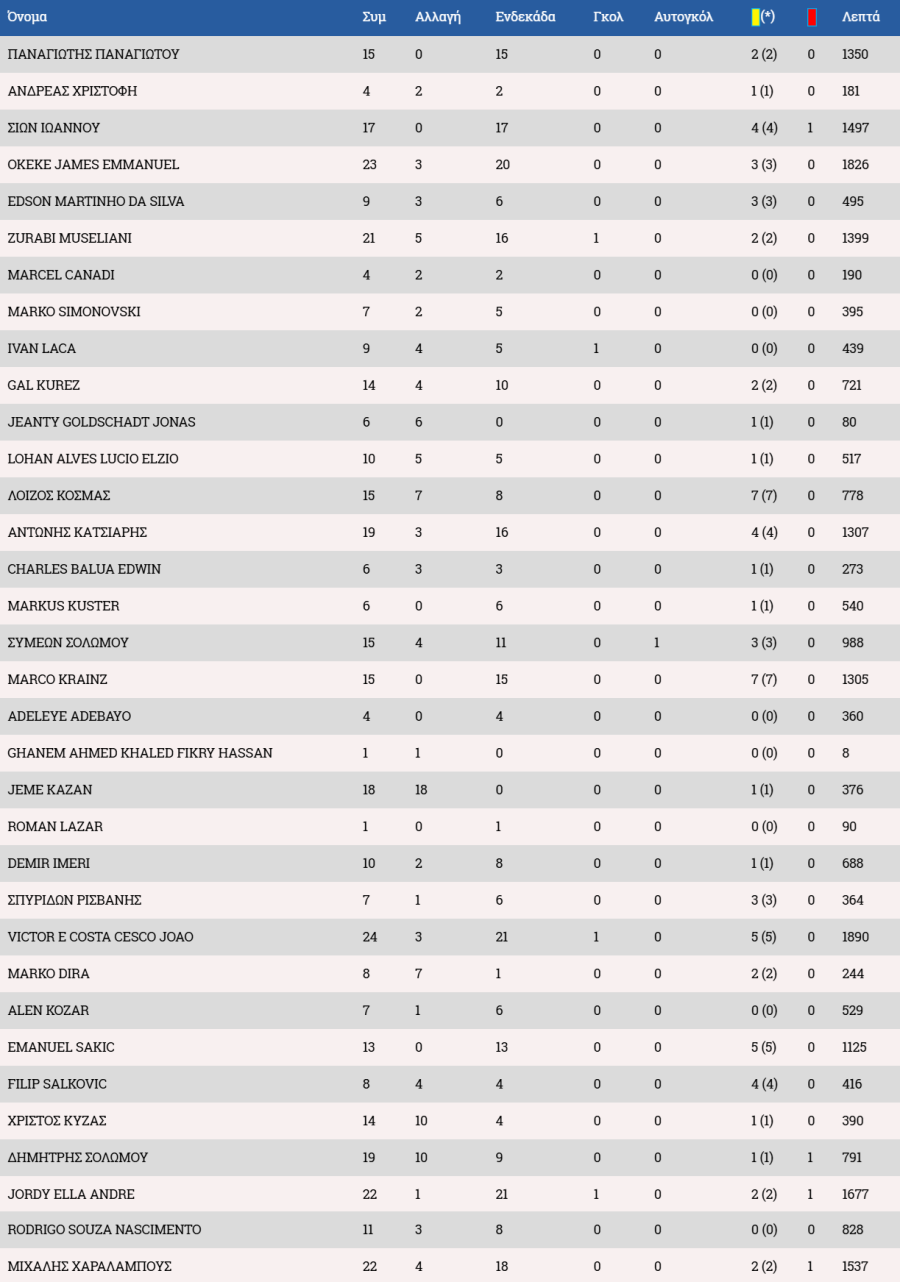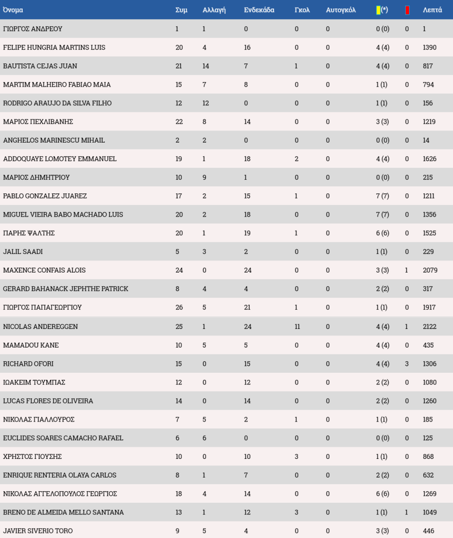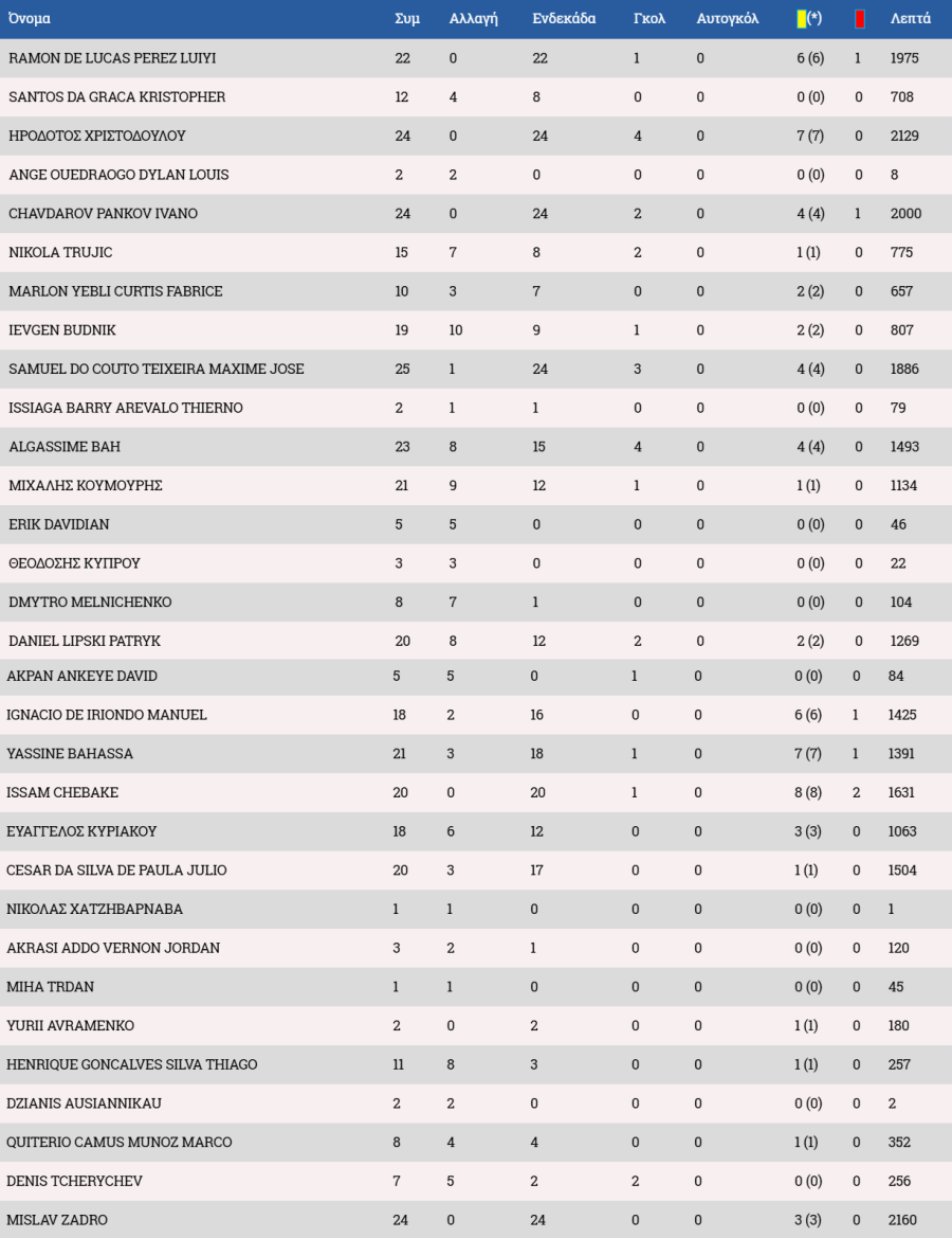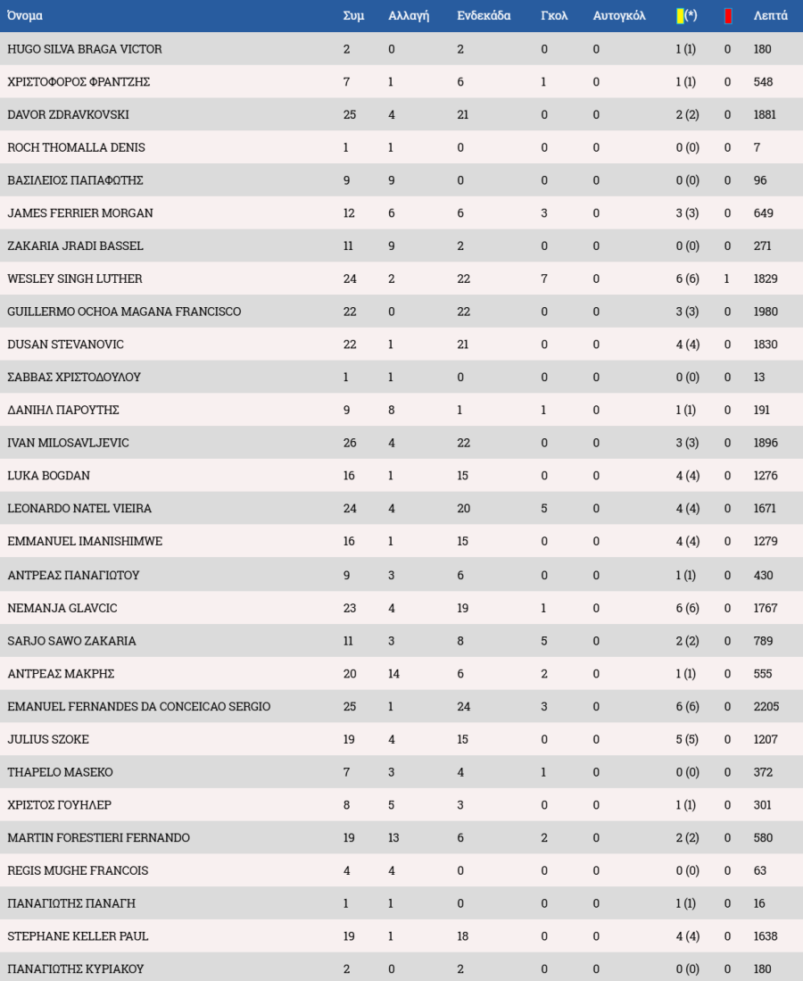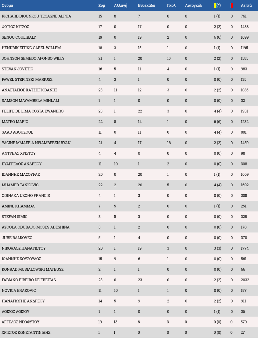 Στον πάγκο οι Αντεμπάγιο, Λαζάρ, Χριστοδούλου, Χριστοφή, Ιωάννου Α., Αχμέντ, Ρισβάνης