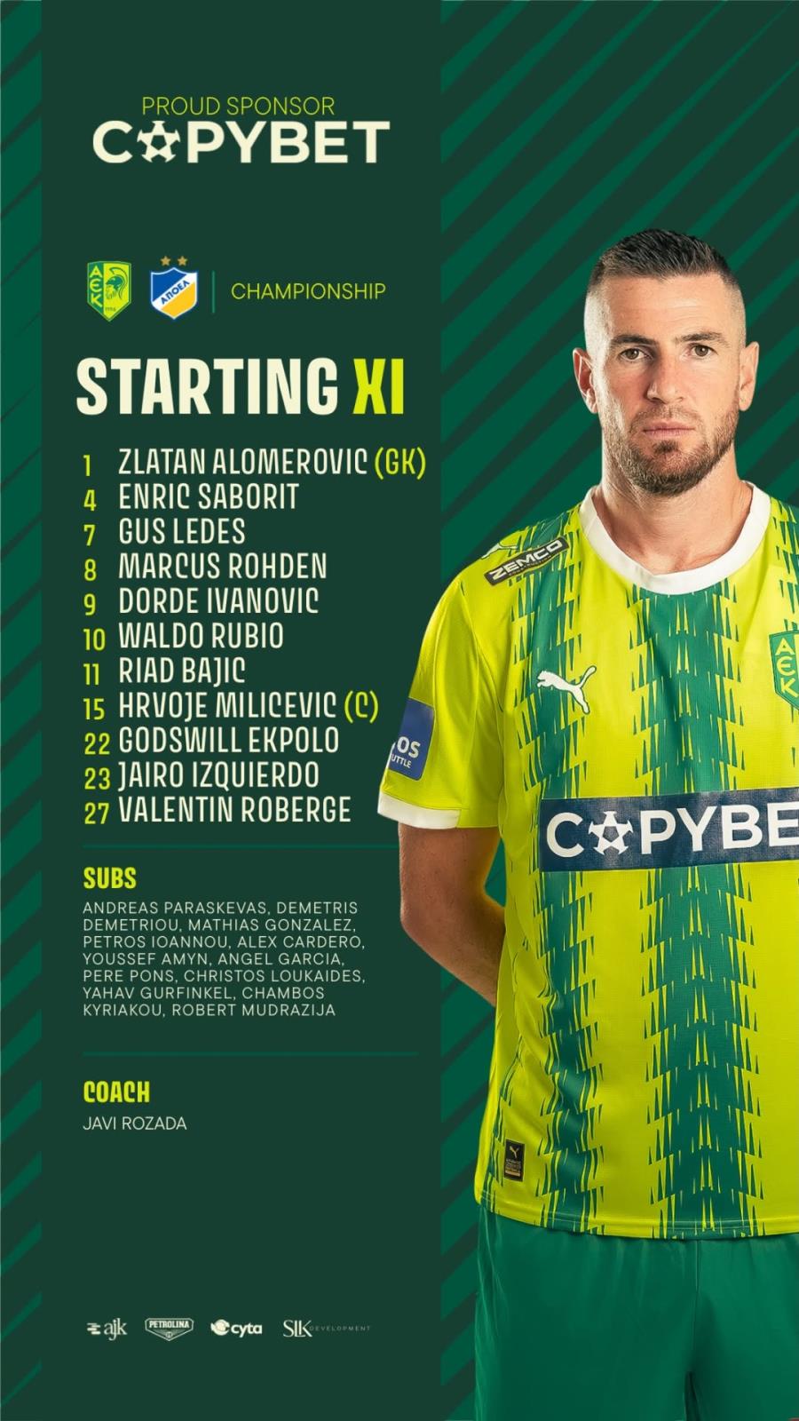 ΑΕΚ (Χάβι Ροθάδα): Aλομέροβιτς, Εκπολό, Μιλίτσεβιτς, Ρομπέρζ, Σαμπόριτ (62′ Ιωάννου), Λέντες (70′ Πονς), Ροντέν, Ιβάνοβιτς (70′ Γούρφινκελ), Ρούμπιο (62′ Καρδέδο), Ισκιέρδο (87′ Κυριάκου), Μπάγιτς.