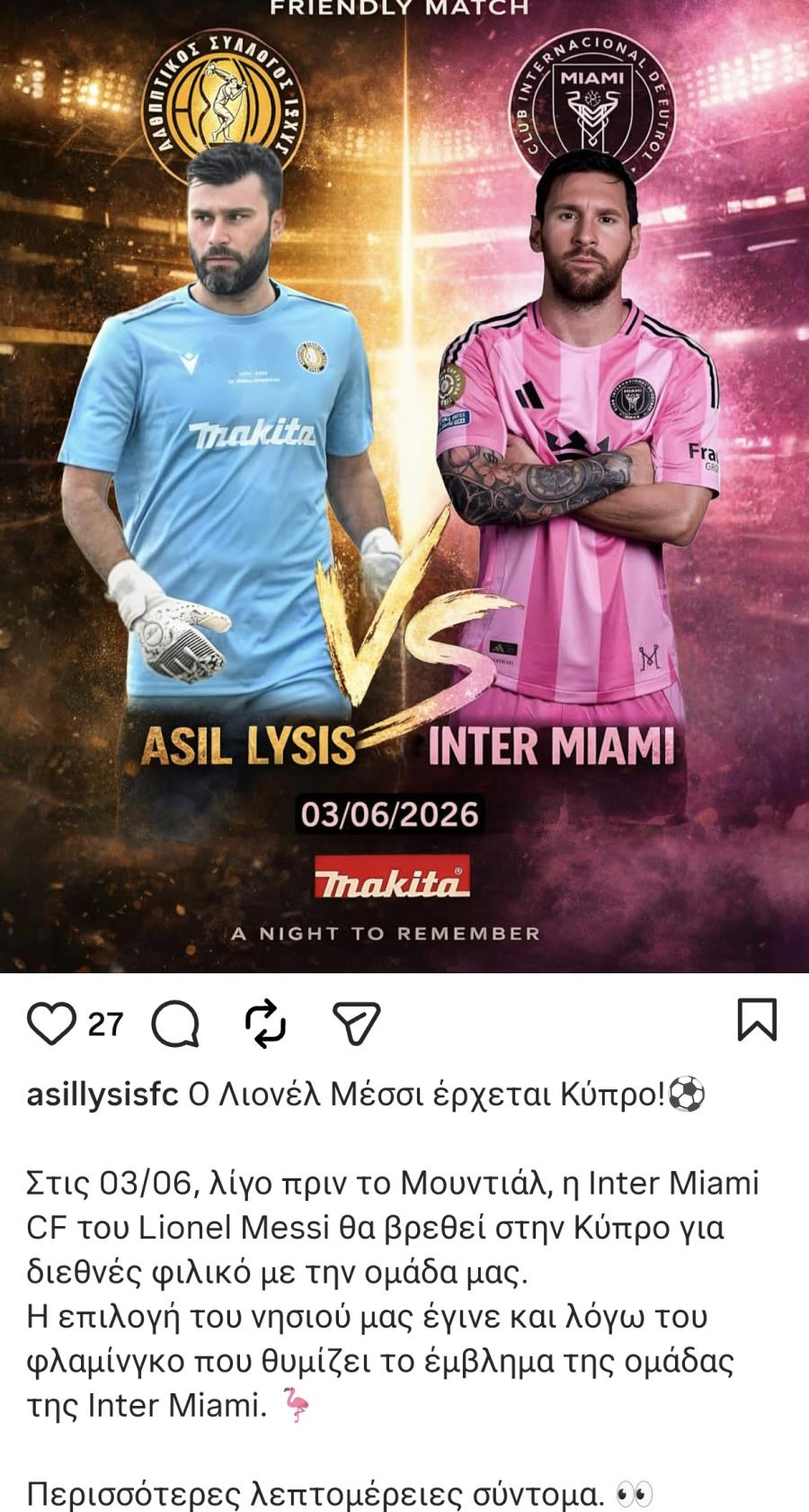 Ο ΑΣΙΛ αναφέρει ότι έρχεται στην Κύπρο ο Λιονέλ Μέσι στις 03/06 λίγο πριν το Μουντιάλ. Θυμίζουμε ότι σήμερα είναι 1η Απριλίου.