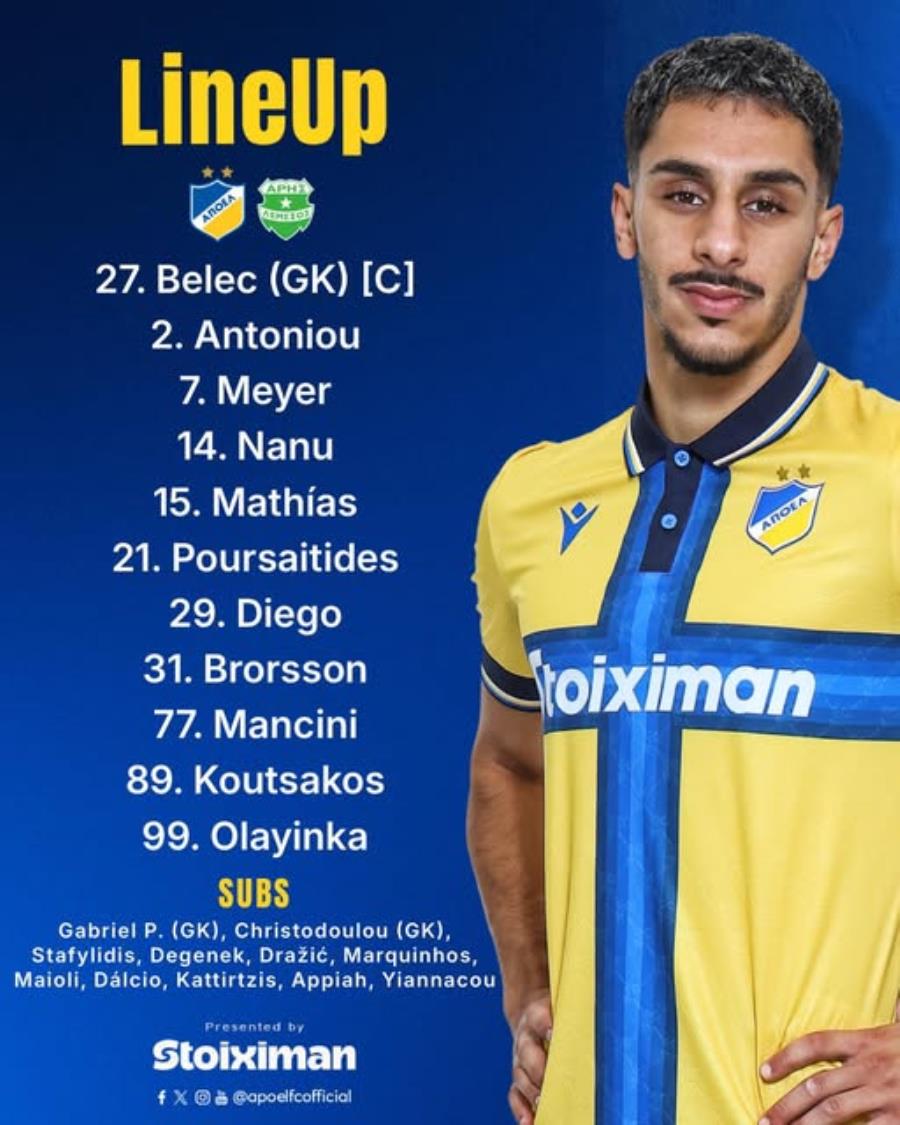 Άρης: Βανά Άλβες, Λέλε(Σανέ 86), Κορέια, Γιαγκό, Μπαλόγκουν, Κάστανος, Γκάουσταντ(Κακόριν 70'), Μοντνόρ(Γκομίς 86'), Χαραλάμπους, Ακάμπα(Παζέ 22'), Εφαγκέ(Κακουλλής 70').