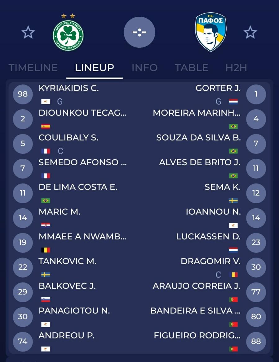Στον πάγκο για την Πάφο: Μιχαήλ, Παπαδούδης, Πηλέας, Μπασουαμινά, Όρσιτς, Λεάντερσον, Γκουσάντ, Όντεφαλκ, Μίμοβιτς, Άντερσον, Μπρίτο, Χριστοφόρου