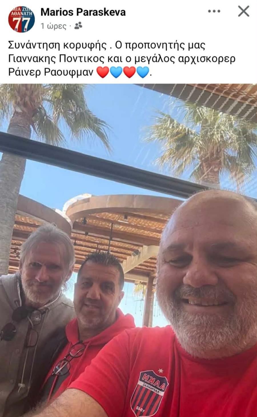 Ο πρόεδρος της Αλκής, Μάριος Παρασκευά, είχε συνάντηση κορυφής με τον προπονητή της «Αθάνατης» Γιαννάκη Ποντικό και την παλιά μεγάλη δόξα της Ομόνοιας, Ράινερ Μάρκο Ράουφμαν!