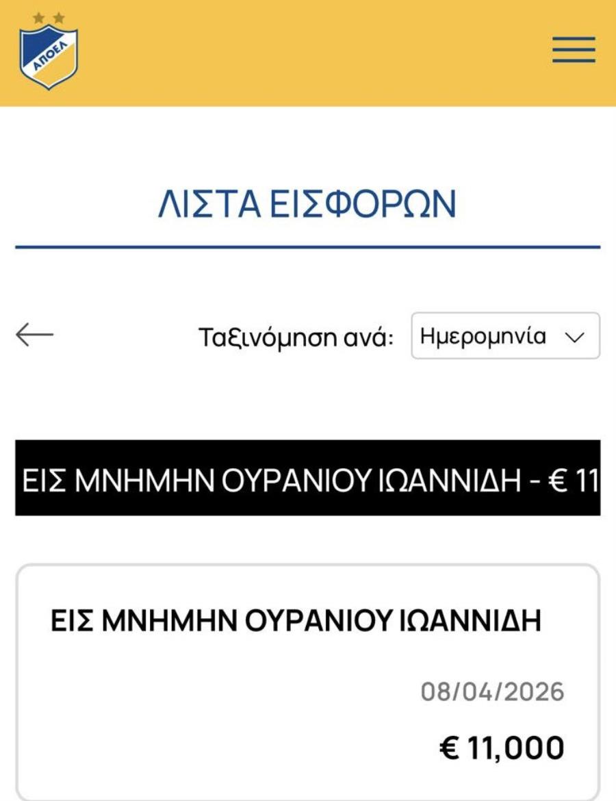 Πριν από λίγο στην πλατφόρμα οικονομικής ενίσχυσης «Ο ΑΠΟΕΛ ΕΙΣΑΙ ΕΣΥ, Για το παρόν και το μέλλον» πραγματοποιήθηκε, η υψηλότερη μέχρι στιγμής εισφορά από την οικογένεια και εις μνήμη Ουράνιου Ιωαννίδη. Ενός ανθρώπου που ταύτισε την ζωή του τόσο με τον ΑΠΟΕΛ όσο και με τα κοινά και τον πολιτισμό ολόκληρης της Κύπρου.