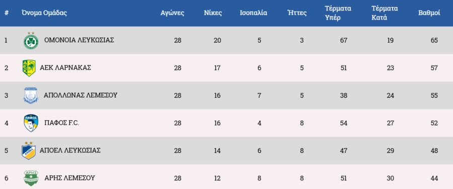 Η πρωτοπόρος Ομόνοια είναι στο +8 από την δεύτερη ΑΕΚ και μένει να δούμε αν η ομάδα της Λάρνακας ή ο Απόλλωνας που βίσκεται στο -10 μειώσουν την απόσταση και αναθερμάνουν το ενδιαφέρον στη μάχη του τίτλου, ή αν οι πράσινοι διατηρήσουν το ισχυρό προβάδισμα.