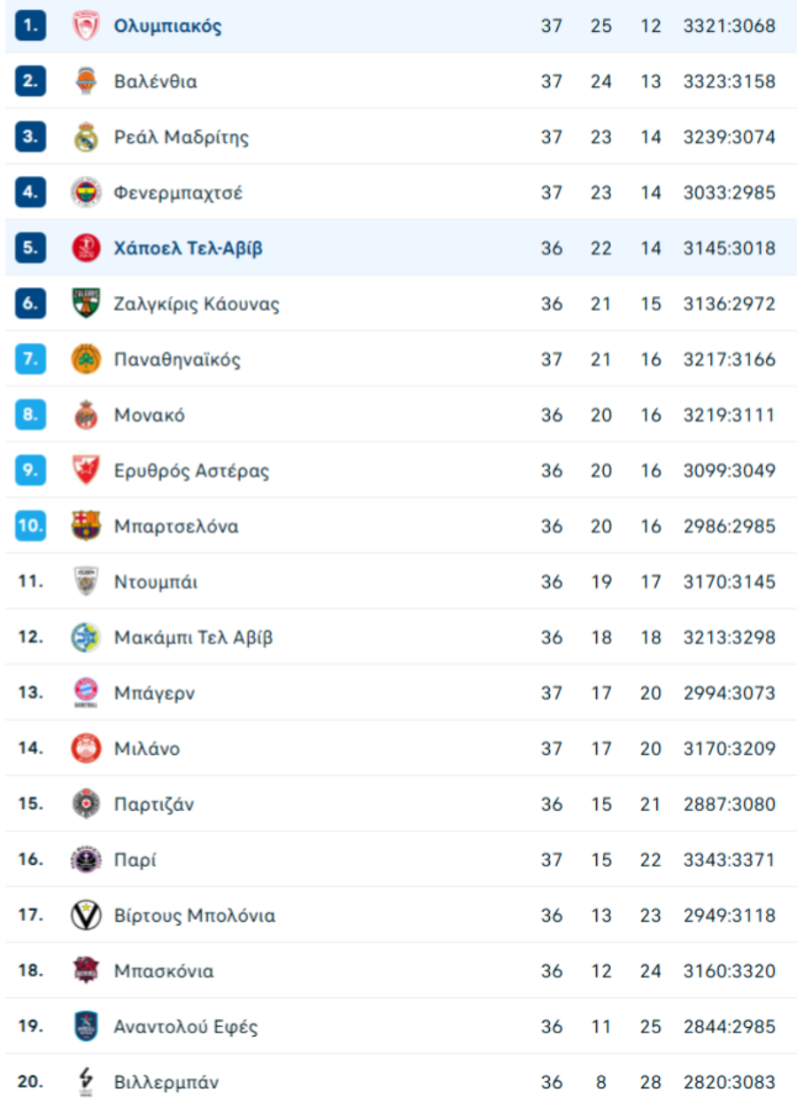 Βίοι αντίθετοι για τους δύο «αιώνιους» στην 37η αγωνιστική της Ευρωλίγκας, καθώς ο Ολυμπιακός νίκησε τη Χάποελ Τελ Αβίβ και πλησίασε την πρωτιά της κανονικής περιόδου, ενώ ο Παναθηναϊκός έχασε από τη Βαλένθια και φαίνεται πως οδεύει για τον... δύσκολο δρόμο προς τα playoffs.