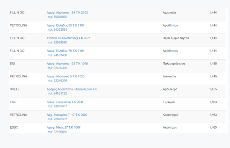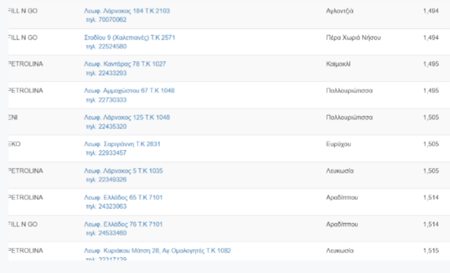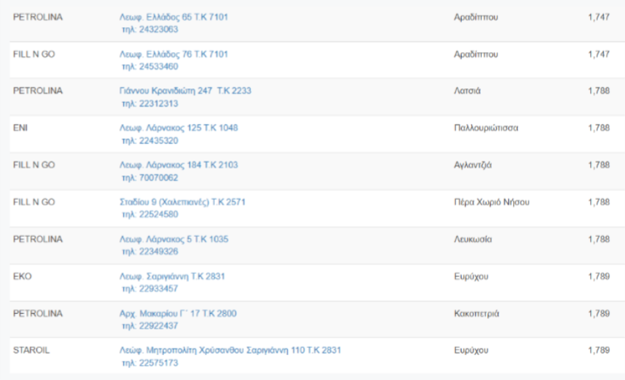 Όσον αφορά το πετρέλαιο κίνησης, η μέση τιμή παγκύπρια διαμορφώνεται στα €1,843, με τη χαμηλότερη τιμή να καταγράφεται στα €1,747 και την υψηλότερη στα €1,899.