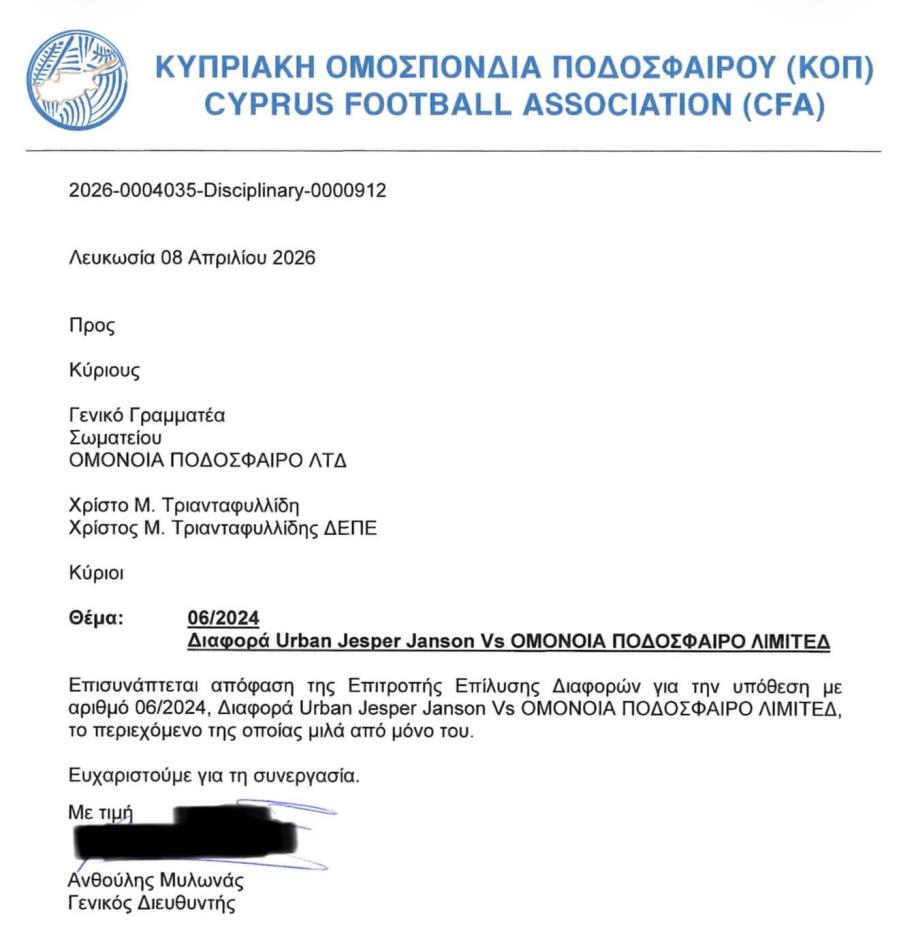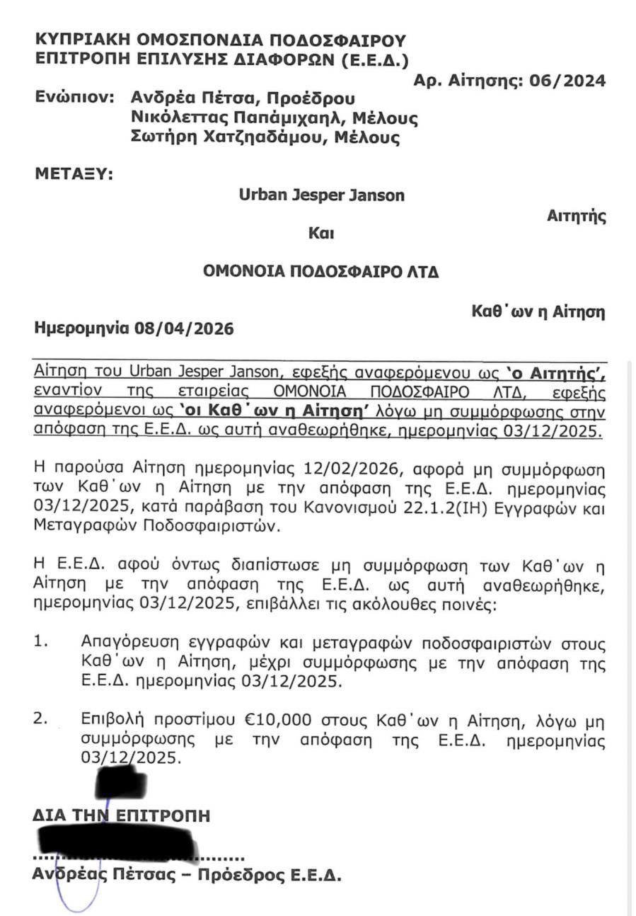 3. Το Δικηγορικό Γραφείο του κ. Κρις Τριανταφυλλίδη απειλεί και εκβιάζει την ΟΜΟΝΟΙΑ πως θα καταχωρήσει αίτηση διάλυσης κατά της ΟΜΟΝΟΙΑΣ στην βάση του ότι αδυνατεί να πληρώσει τα χρέη της, λόγω άρνησής της να πληρώσει στον κ. Γιάνσον το χρηματικό ποσό που εκδίκασε η ΕΕΔ της ΚΟΠ. Μάλιστα μας έθεσε και τελεσίγραφο μέχρι τις 15 Απριλίου! Αυτός ο εκβιασμός γίνεται την ώρα που η απόφαση της ΕΕΔ δεν είναι τελεσίδικη, εφόσον έχει εφεσιβληθεί στο CAS ενώ την ίδια ώρα η ΕΕΔ έλαβε το εξαιρετικό μέτρο της απαγόρευσης μεταγραφών.