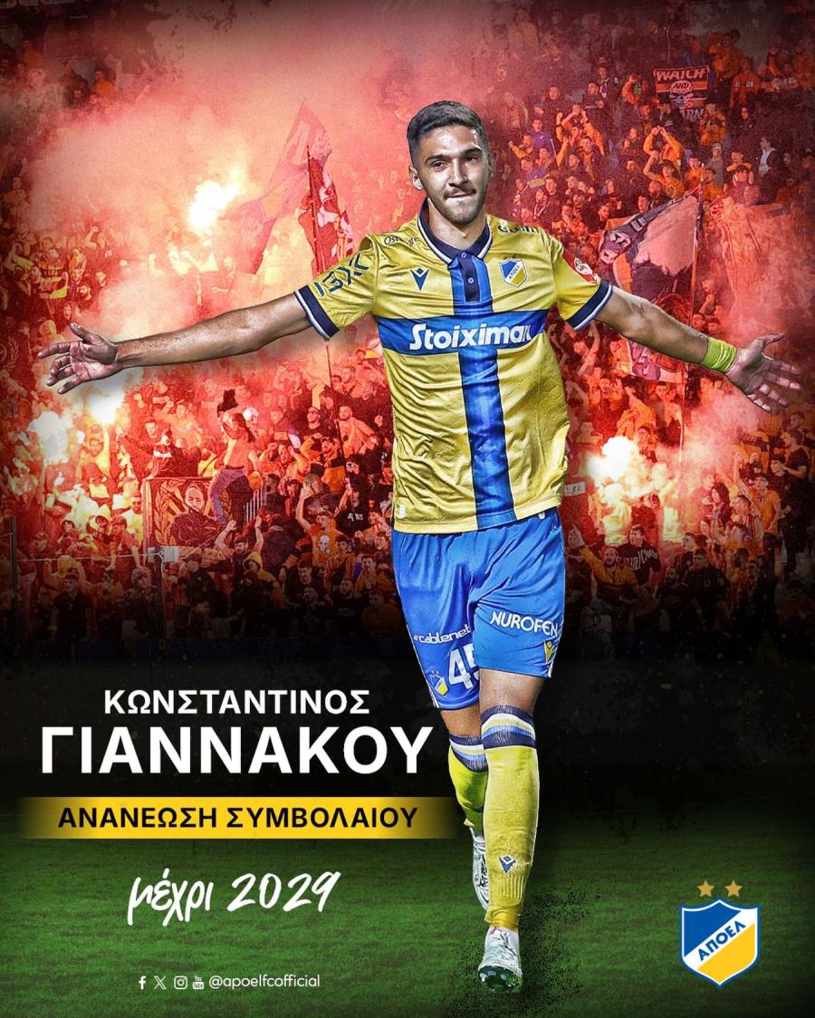 Η εταιρεία ΑΠΟΕΛ ΠΟΔΟΣΦΑΙΡΟ (ΔΗΜΟΣΙΑ) ΛΤΔ ανακοινώνει την επέκταση της συνεργασίας της, με τον ποδοσφαιριστή Κωνσταντίνο Γιαννακού. Ο Κωνσταντίνος  είναι γεννημένος στις 25/04/2005 (21 ετών) και ήταν μέλος της ακαδημίας ΑΠΟΕΛ αγωνιζόμενος σε όλες τις ηλικιακές ομάδες της ανώτατης κατηγορίας μέχρι και την ομάδα Ανδρών. Το συμβόλαιο συνεργασίας είναι μέχρι τον Μάιο του 2029. #APOELFC #monoAPOEL