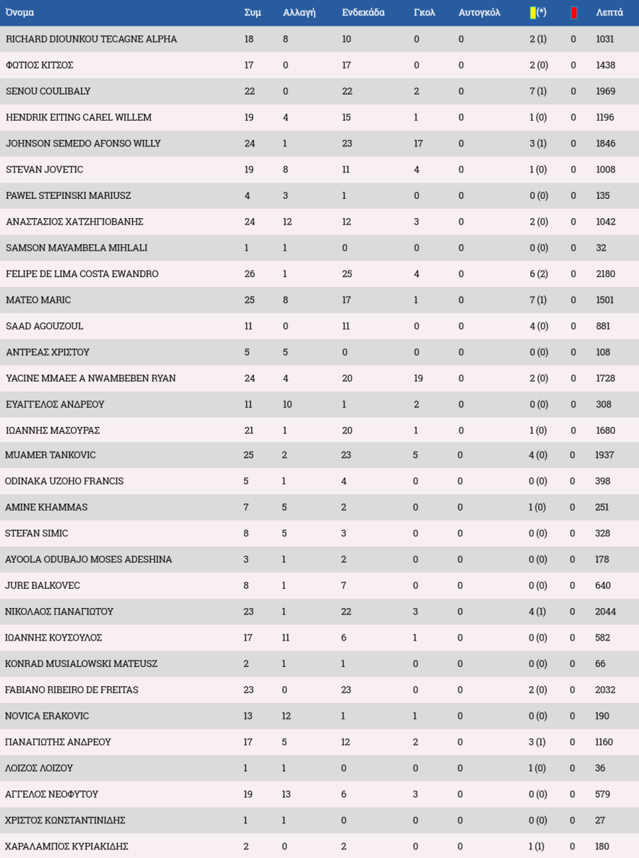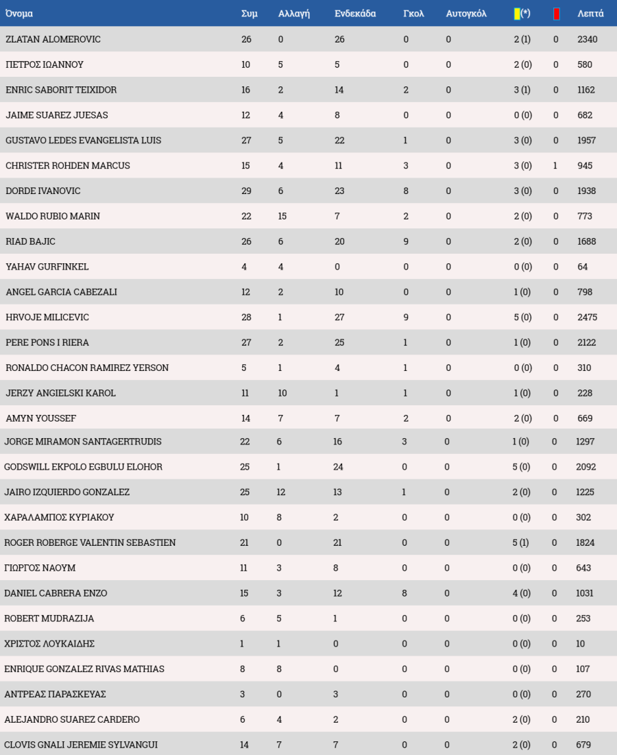 Στον πάγκο οι: Μιχαήλ, Χατζηγιοβάνης, Α. Ανδρέου, Μασούρας, Σίμιτς, Ουνταμπάτζο, Νεοφύτου.