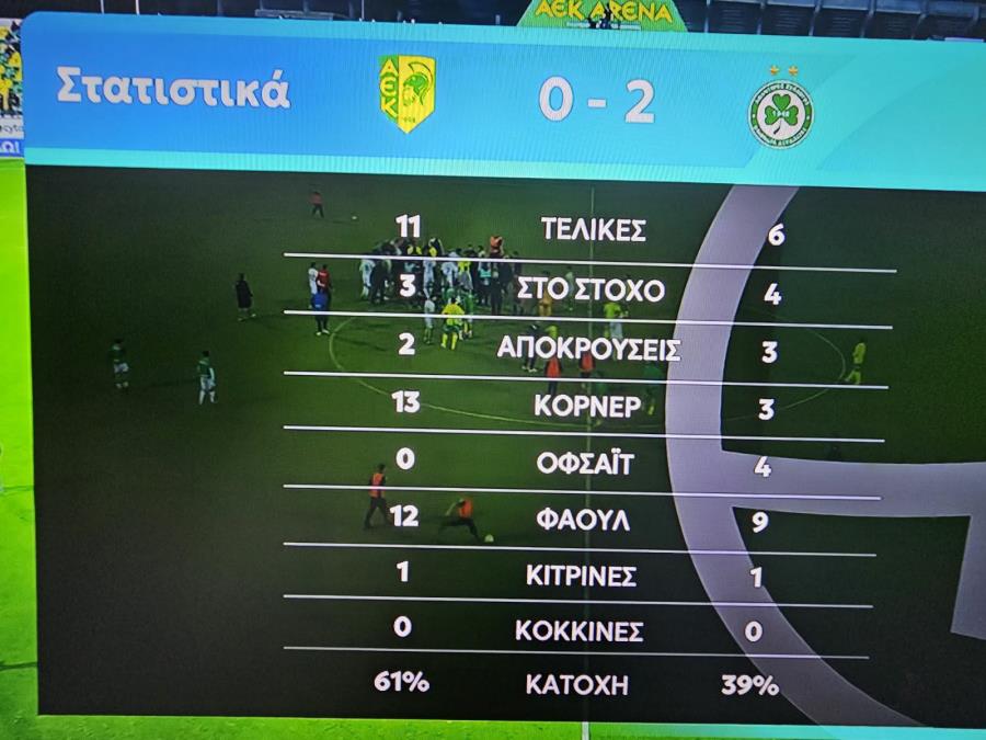 *Κίτρινη στον προπονητή φυσικής κατάστασης της ΑΕΚ Σωτήρη Ρούση στο 40'