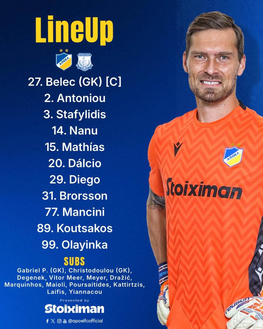 ΑΠΟΕΛ: Μπέλετς, Αντωνίου, Μπρόρσον, Σταφυλίδης, Νανού, Ντάλσιο, Ρόσα, Τομάς, Μαντσίνι, Ολαγίνκα, Κούτσακος.