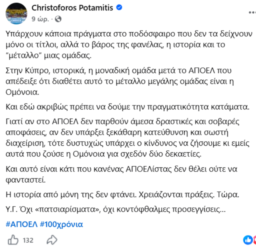 Γιατί αν στο ΑΠΟΕΛ δεν παρθούν άμεσα δραστικές και σοβαρές αποφάσεις, αν δεν υπάρξει ξεκάθαρη κατεύθυνση και σωστή διαχείριση, τότε δυστυχώς υπάρχει ο κίνδυνος να ζήσουμε κι εμείς αυτά που ζούσε η Ομόνοια για σχεδόν δύο δεκαετίες.