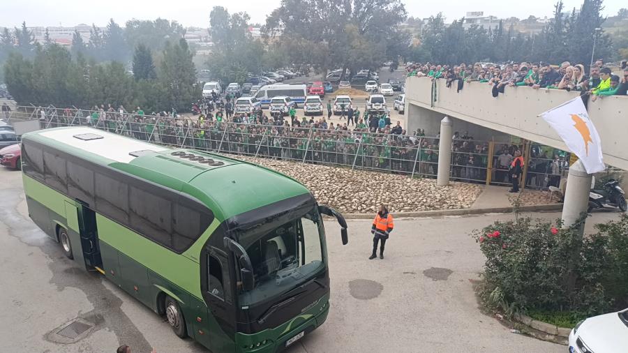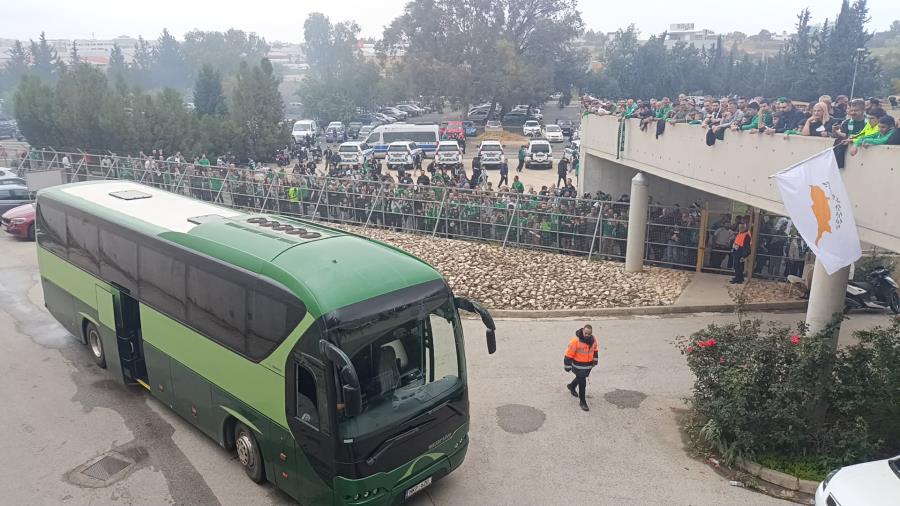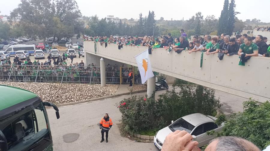 Εκατοντάδες φίλοι της Ομόνοιας που είχαν συγκεντρωθεί από νωρίς, επεφύλαξαν μια αποθεωτική υποδοχή στους ποδοσφαιριστές και το τεχνικό επιτελείο, κάνοντας αισθητή την παρουσία τους.