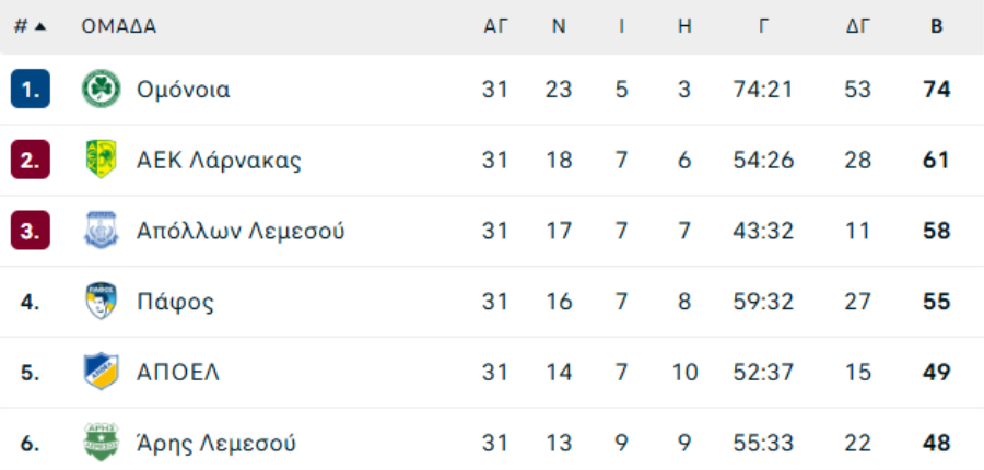 Η Ομόνοια με 74 βαθμούς διατήρησε το προβάδισμα +13 από τη δεύτερη ΑΕΚ και αυξάνονται οι πιθανότητες κατάκτησης του τίτλου στην πρεμιέρα του β'γύρου των πλέι οφ.