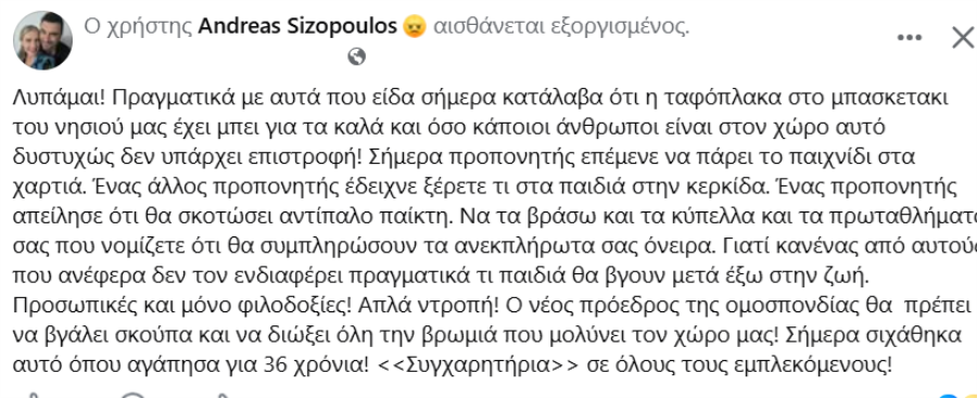 «Λυπάμαι! Πραγματικά με αυτά που είδα σήμερα κατάλαβα ότι η ταφόπλακα στο μπασκετακι του νησιού μας έχει μπει για τα καλά και όσο κάποιοι άνθρωποι είναι στον χώρο αυτό δυστυχώς δεν υπάρχει επιστροφή! Σήμερα προπονητής επέμενε να πάρει το παιχνίδι στα χαρτιά. Ένας άλλος προπονητής έδειχνε ξέρετε τι στα παιδιά στην κερκίδα. Ένας προπονητής απείλησε ότι θα σκοτώσει αντίπαλο παίκτη. Να τα βράσω και τα κύπελλα και τα πρωταθλήματά σας που νομίζετε ότι θα συμπληρώσουν τα ανεκπλήρωτα σας όνειρα. Γιατί κανένας από αυτούς που ανέφερα δεν τον ενδιαφέρει πραγματικά τι παιδιά θα βγουν μετά έξω στην ζωή. Προσωπικές και μόνο φιλοδοξίες! Απλά ντροπή! Ο νέος πρόεδρος της ομοσπονδίας θα πρέπει να βγάλει σκούπα και να διώξει όλη την βρωμιά που μολύνει τον χώρο μας! Σήμερα σιχάθηκα αυτό όπου αγάπησα για 36 χρόνια! <<Συγχαρητήρια>> σε όλους τους εμπλεκόμενους!»
