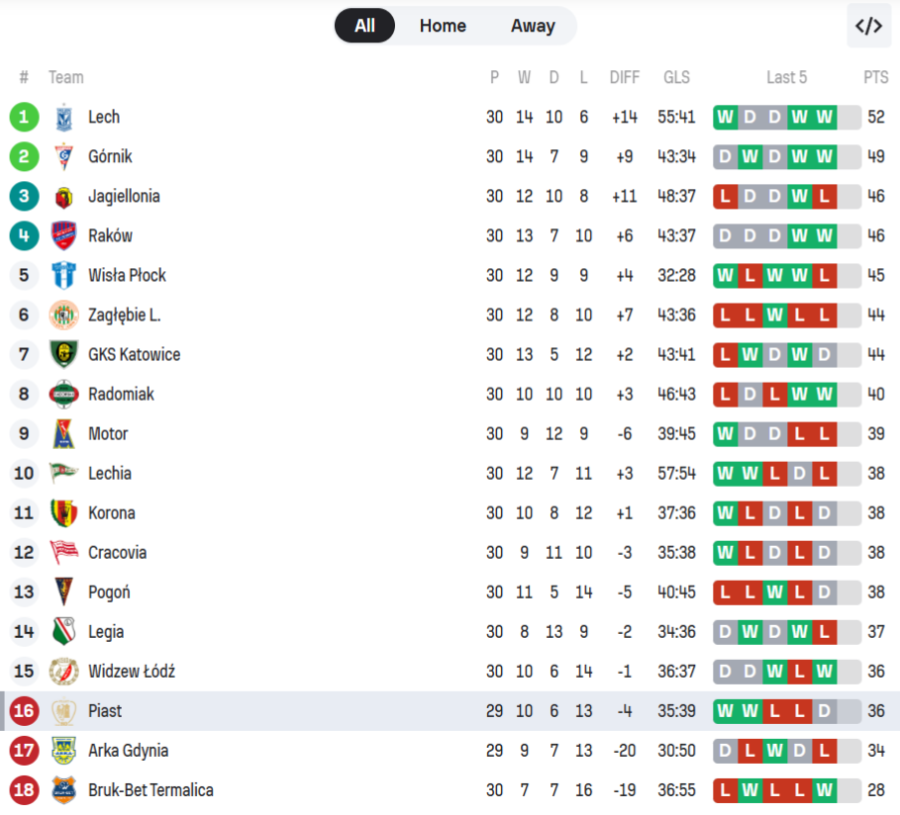Την ίδια στιγμή, η Λέγκια βυθίζεται ακόμη περισσότερο στη μάχη της παραμονής, παρότι αποτελεί την πιο επιτυχημένη ομάδα στην ιστορία του πολωνικού ποδοσφαίρου και δεν έχει υποβιβαστεί ποτέ από την κορυφαία κατηγορία. Η πίεση, όμως, ενόψει των τελευταίων αγωνιστικών είναι πλέον τεράστια!