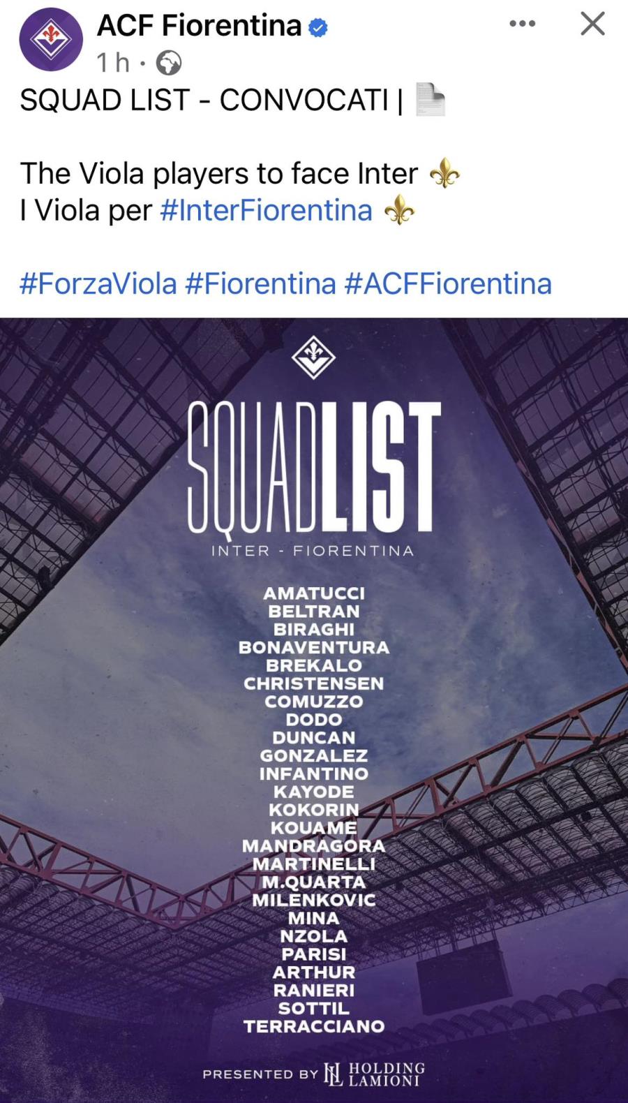 Ο Αλεξάντερ Κακόριν είναι στην αποστολή της Φιορεντίνα για το ματς με την Ίντερ.