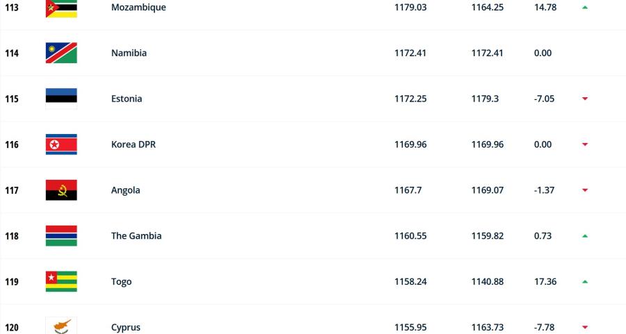 Στην 120ή θέση η Εθνική Κύπρου, έχοντας ακριβώς από πάνω της Εθνικές όπως τις Μοζαμβίκης, Ναμίμπια, Τατζικιστάν, Κένυα και Μαδαγασκάρη.