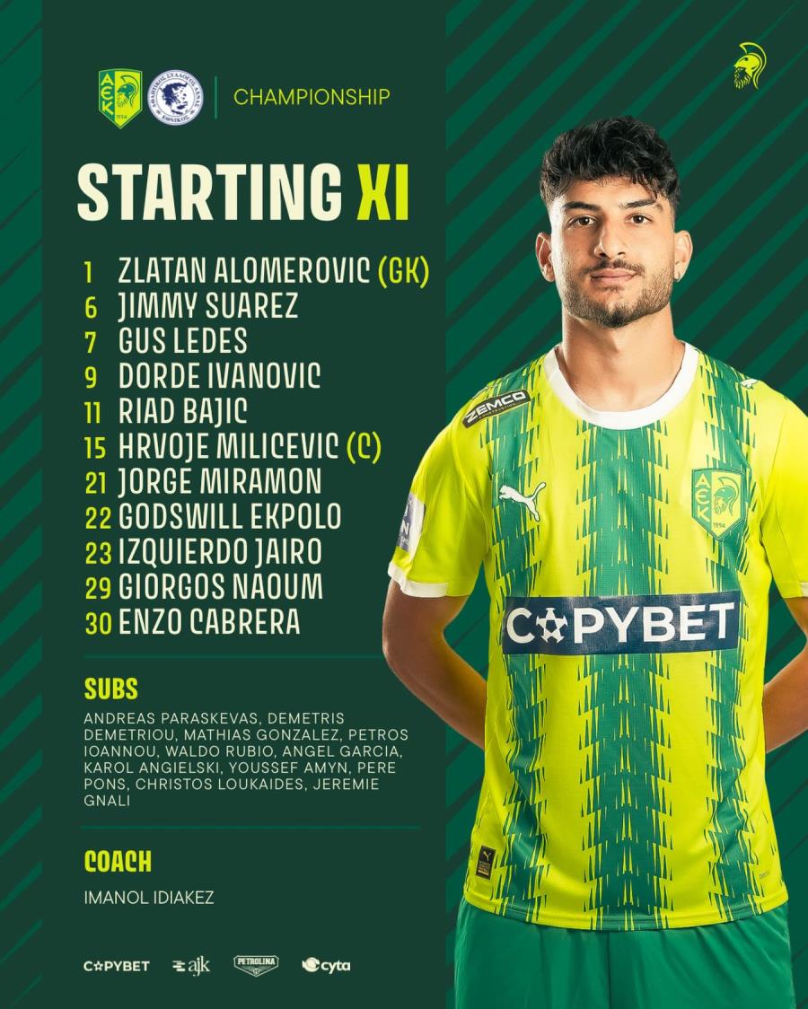 ΑΕΚ: Αλομέροβιτς, Σουάρες, Λέδες, Ιβάνοβιτς, Μπάγιτς, Μιλίσεβιτς, Μιραμόν, Εκπολό, Χάιρο, Ναούμ, Καμπρέρα.