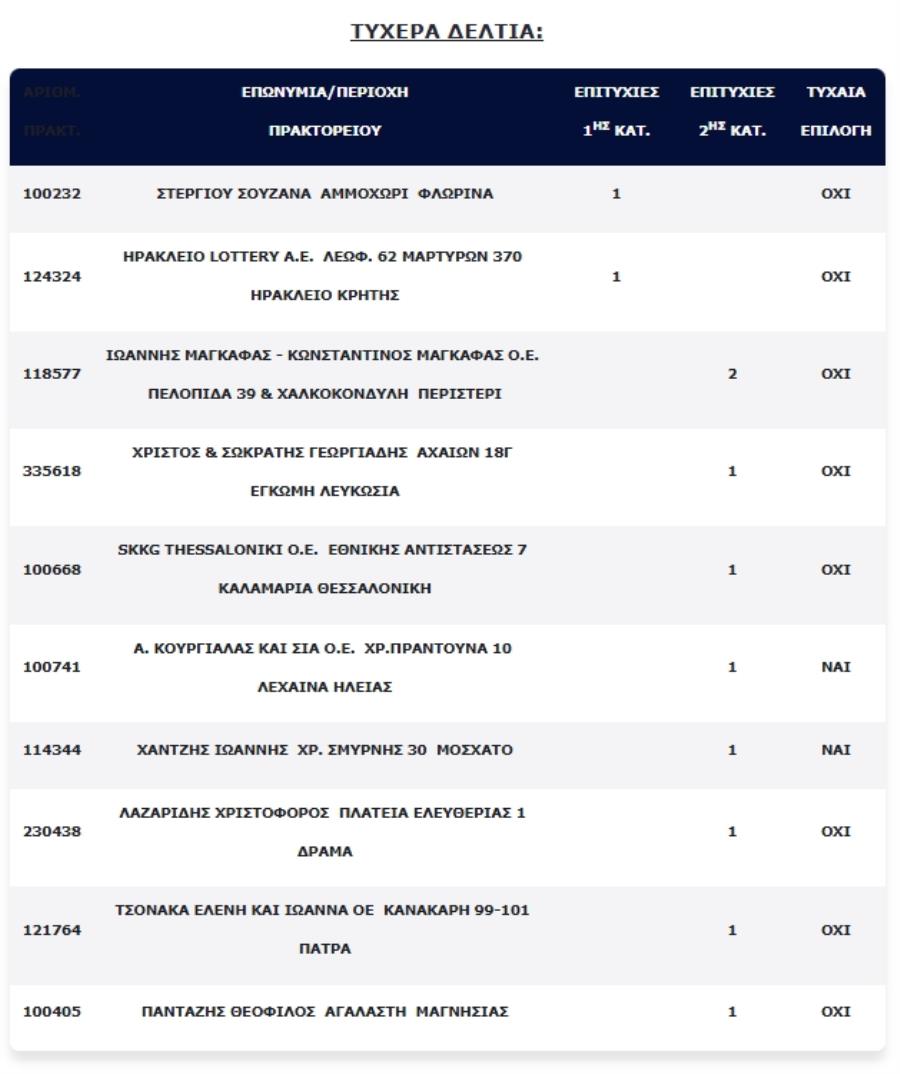 Επίσης, εννιά (9) τυχερά δελτία βρέθηκαν στη 2η κατηγορία (5), τα οποία κερδίζουν το ποσό των €100.000,00 για κάθε επιτυχία.