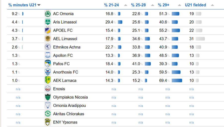 Η Ομόνοια είναι στην πρώτη θέση με 9.2% στα αγωνιστικά λεπτά σε ποδοσφαιριστές Κ21.